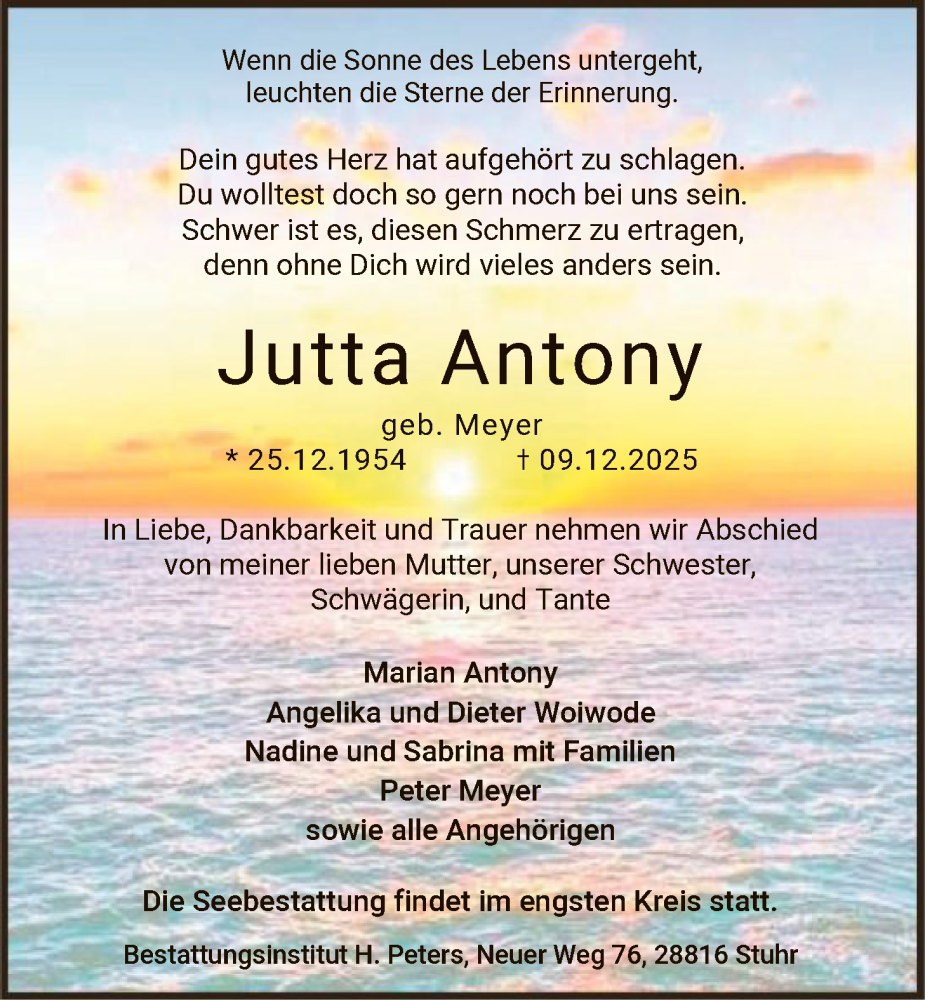 Hier finden Sie alle Traueranzeigen aus der Zeitung, die bisher für Jutta Antony erschienen sind. Weitere Traueranzeigen, die in der Zeitung erscheinen, werden hier ebenfalls aufgelistet