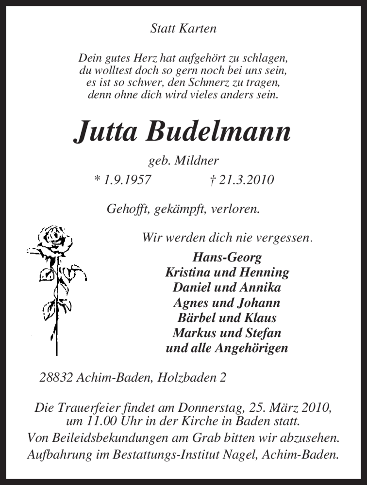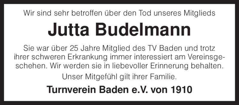 Hier finden Sie alle Traueranzeigen aus der Zeitung, die bisher für Jutta Budelmann erschienen sind. Weitere Traueranzeigen, die in der Zeitung erscheinen, werden hier ebenfalls aufgelistet