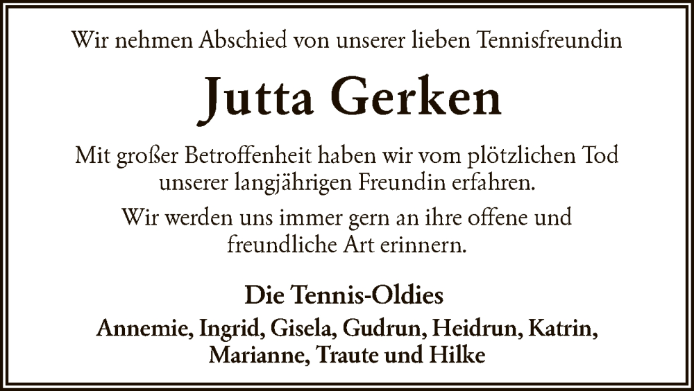 Hier finden Sie alle Traueranzeigen aus der Zeitung, die bisher für Jutta Gerken erschienen sind. Weitere Traueranzeigen, die in der Zeitung erscheinen, werden hier ebenfalls aufgelistet
