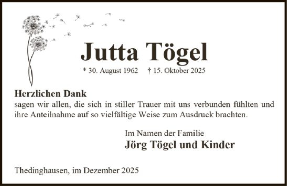 Hier finden Sie alle Traueranzeigen aus der Zeitung, die bisher für Jutta Tögel erschienen sind. Weitere Traueranzeigen, die in der Zeitung erscheinen, werden hier ebenfalls aufgelistet