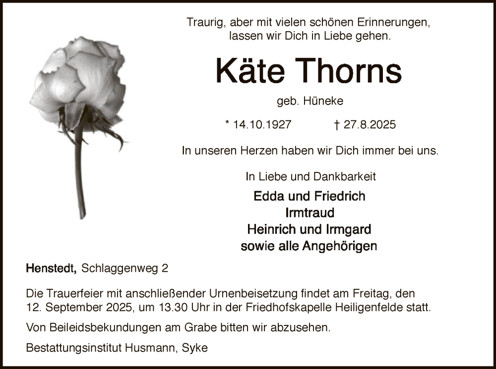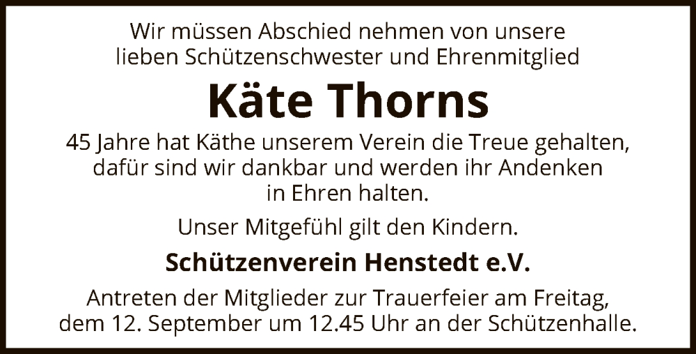 Hier finden Sie alle Traueranzeigen aus der Zeitung, die bisher für Käte Thorns erschienen sind. Weitere Traueranzeigen, die in der Zeitung erscheinen, werden hier ebenfalls aufgelistet