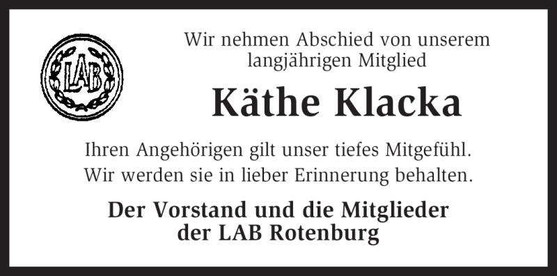 Hier finden Sie alle Traueranzeigen aus der Zeitung, die bisher für Käthe Klacka erschienen sind. Weitere Traueranzeigen, die in der Zeitung erscheinen, werden hier ebenfalls aufgelistet