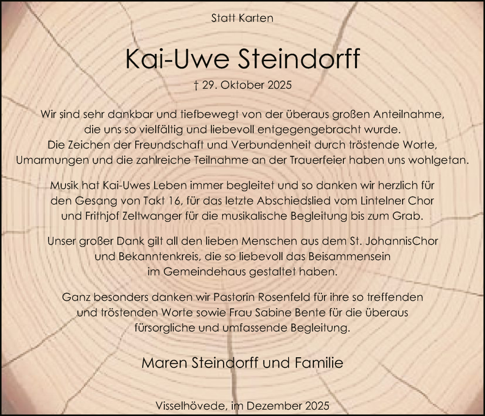 Hier finden Sie alle Traueranzeigen aus der Zeitung, die bisher für Kai-Uwe Steindorff erschienen sind. Weitere Traueranzeigen, die in der Zeitung erscheinen, werden hier ebenfalls aufgelistet