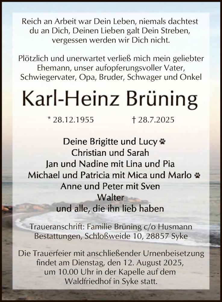 Hier finden Sie alle Traueranzeigen aus der Zeitung, die bisher für Karl-Heinz Brüning erschienen sind. Weitere Traueranzeigen, die in der Zeitung erscheinen, werden hier ebenfalls aufgelistet