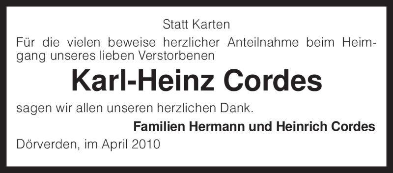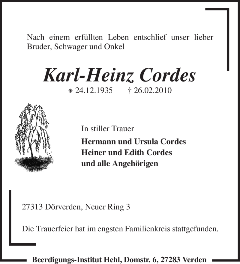 Hier finden Sie alle Traueranzeigen aus der Zeitung, die bisher für Karl-Heinz Cordes erschienen sind. Weitere Traueranzeigen, die in der Zeitung erscheinen, werden hier ebenfalls aufgelistet
