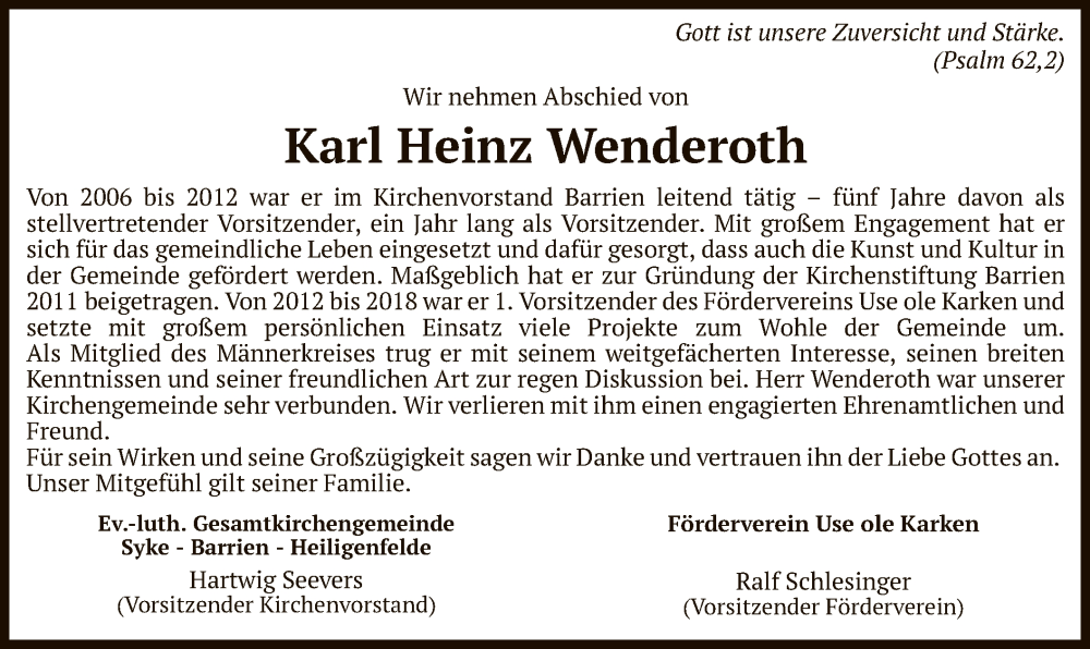 Hier finden Sie alle Traueranzeigen aus der Zeitung, die bisher für Karl Heinz Wenderoth erschienen sind. Weitere Traueranzeigen, die in der Zeitung erscheinen, werden hier ebenfalls aufgelistet
