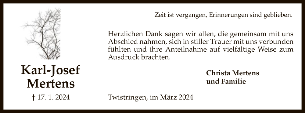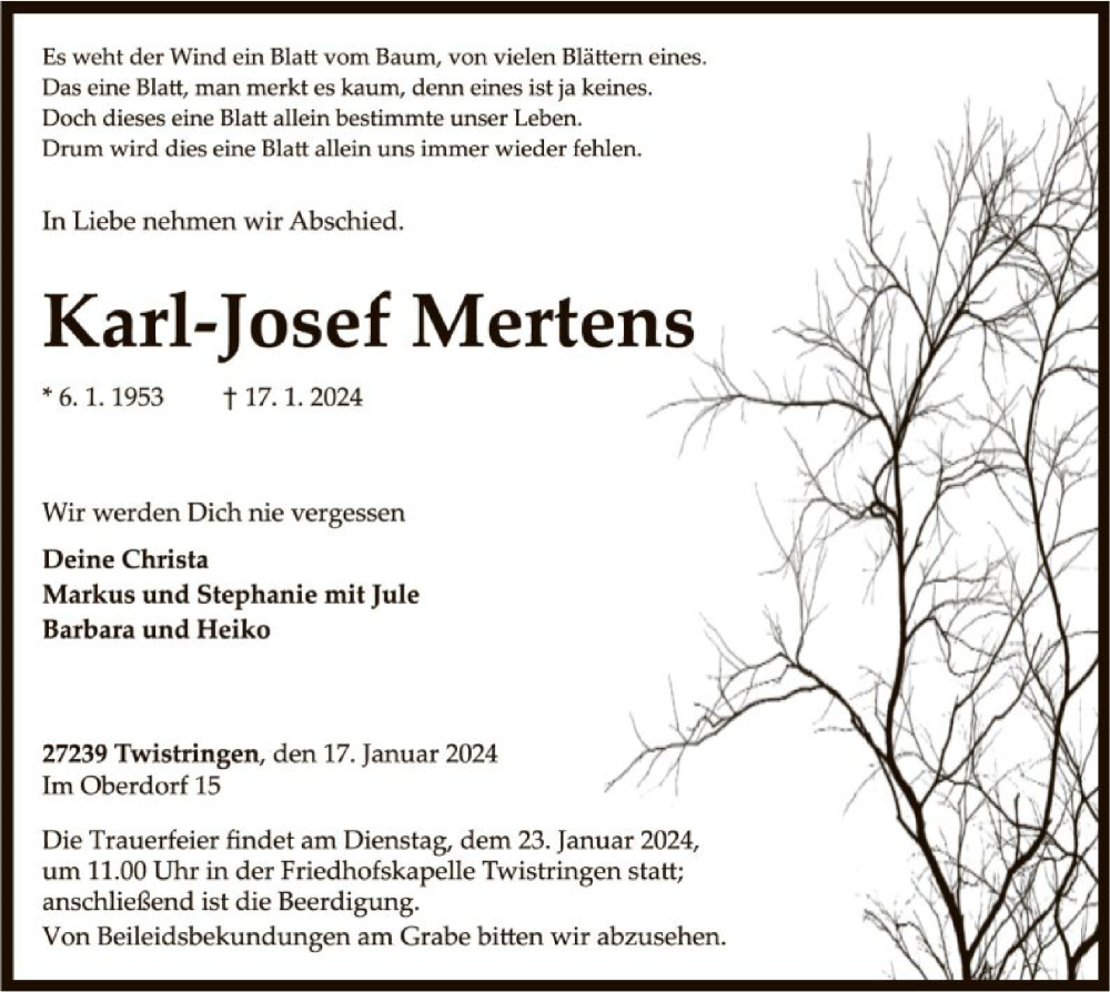Hier finden Sie alle Traueranzeigen aus der Zeitung, die bisher für Karl-Josef Mertens erschienen sind. Weitere Traueranzeigen, die in der Zeitung erscheinen, werden hier ebenfalls aufgelistet