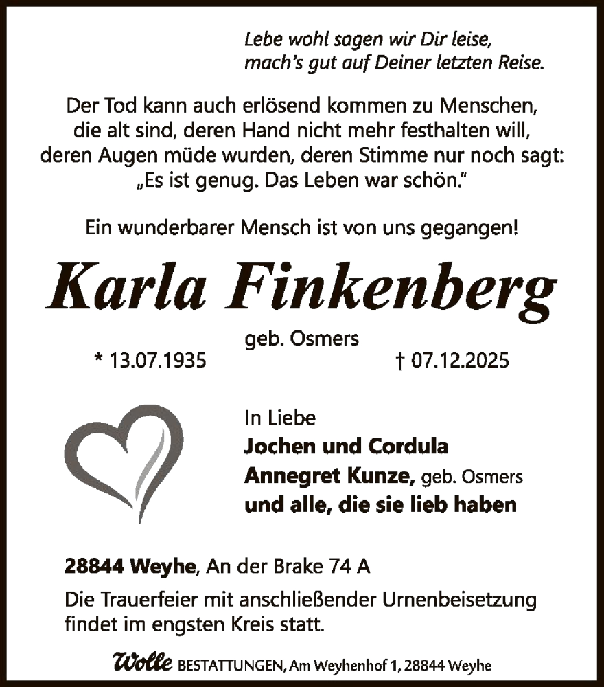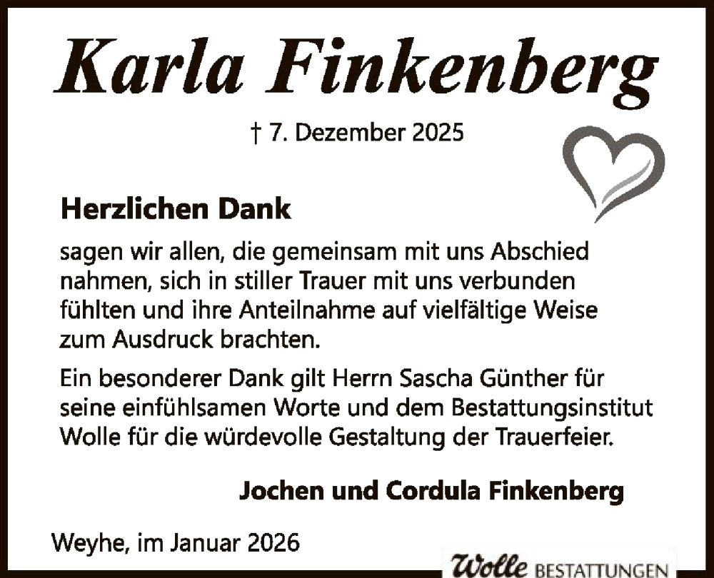 Hier finden Sie alle Traueranzeigen aus der Zeitung, die bisher für Karla Finkenberg erschienen sind. Weitere Traueranzeigen, die in der Zeitung erscheinen, werden hier ebenfalls aufgelistet