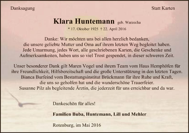 Hier finden Sie alle Traueranzeigen aus der Zeitung, die bisher für Klara Huntemann erschienen sind. Weitere Traueranzeigen, die in der Zeitung erscheinen, werden hier ebenfalls aufgelistet