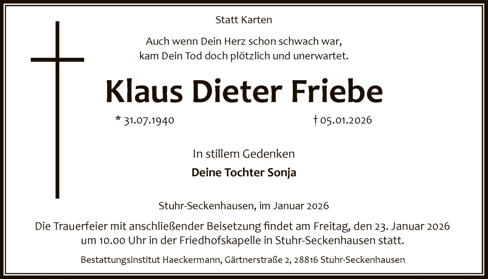 Hier finden Sie alle Traueranzeigen aus der Zeitung, die bisher für Klaus Dieter Friebe erschienen sind. Weitere Traueranzeigen, die in der Zeitung erscheinen, werden hier ebenfalls aufgelistet