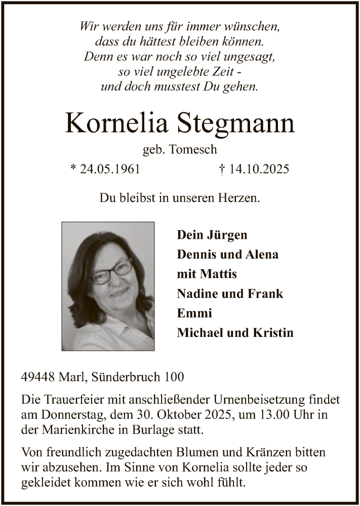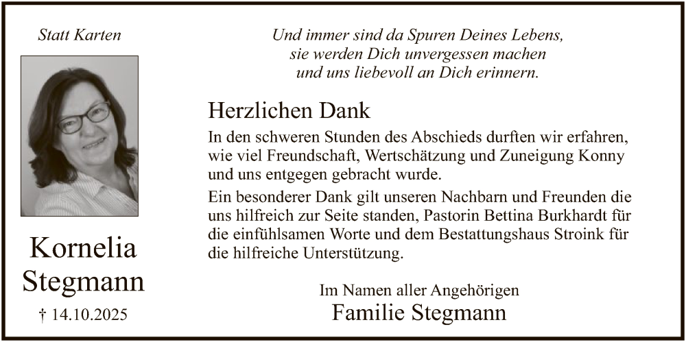 Hier finden Sie alle Traueranzeigen aus der Zeitung, die bisher für Kornelia Stegmann erschienen sind. Weitere Traueranzeigen, die in der Zeitung erscheinen, werden hier ebenfalls aufgelistet