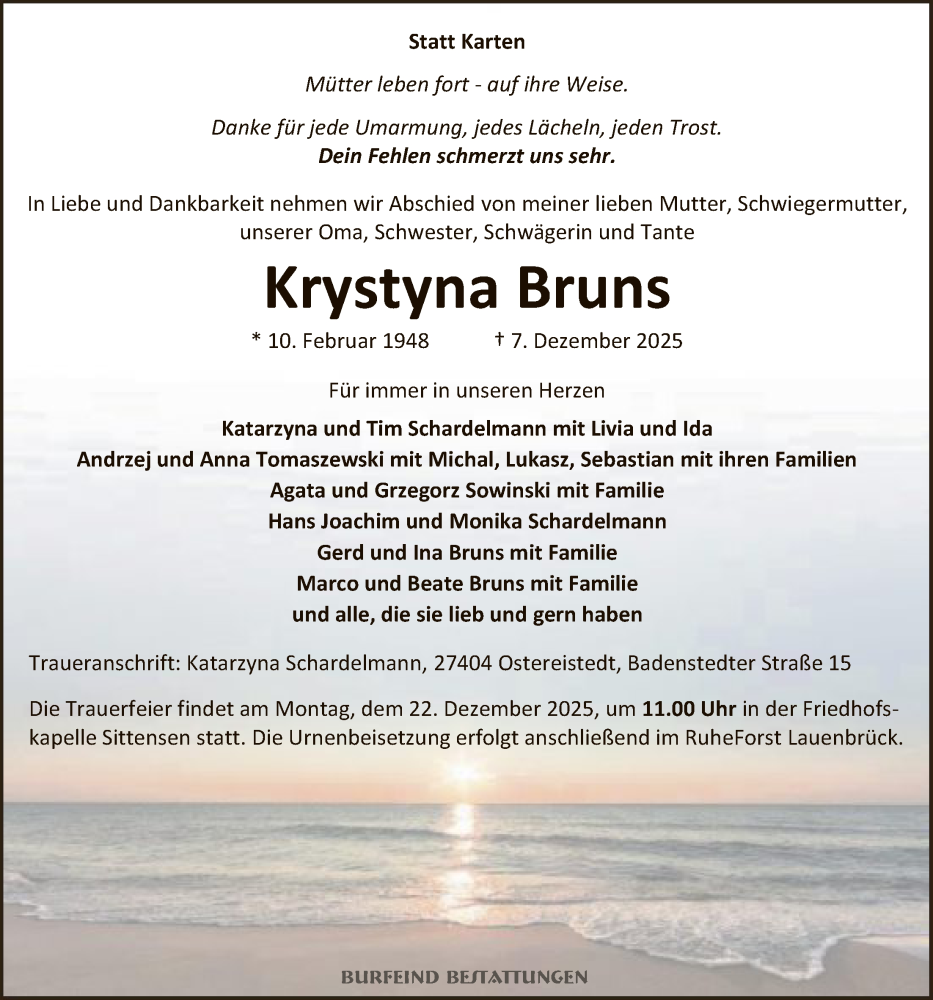 Hier finden Sie alle Traueranzeigen aus der Zeitung, die bisher für Krystyna Bruns erschienen sind. Weitere Traueranzeigen, die in der Zeitung erscheinen, werden hier ebenfalls aufgelistet