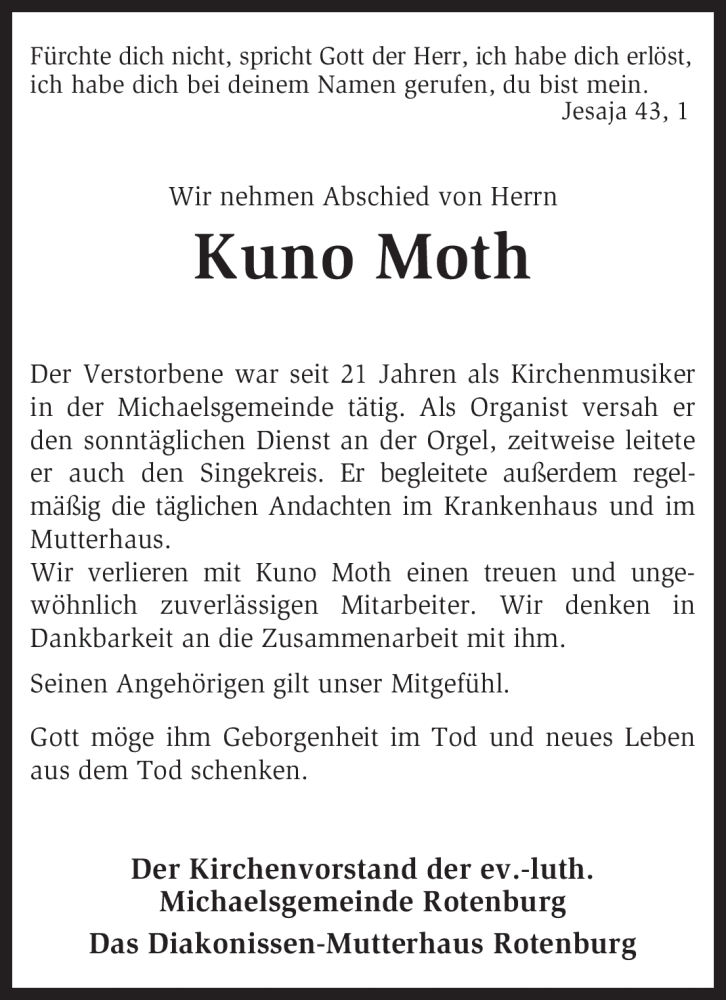 Hier finden Sie alle Traueranzeigen aus der Zeitung, die bisher für Kuno Moth erschienen sind. Weitere Traueranzeigen, die in der Zeitung erscheinen, werden hier ebenfalls aufgelistet