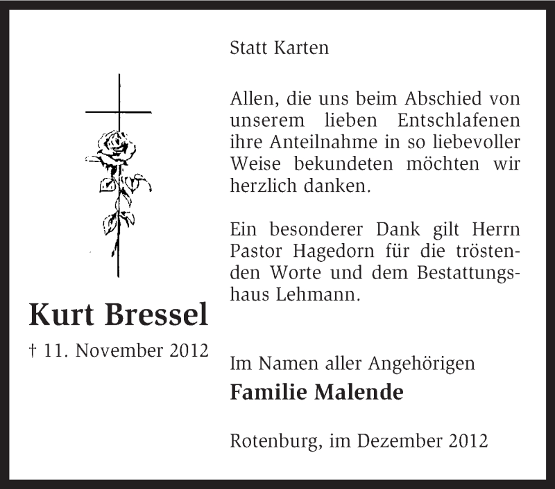 Hier finden Sie alle Traueranzeigen aus der Zeitung, die bisher für Kurt Bressel erschienen sind. Weitere Traueranzeigen, die in der Zeitung erscheinen, werden hier ebenfalls aufgelistet