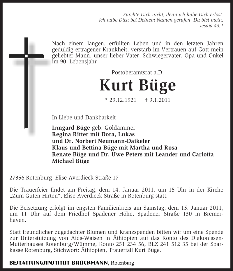 Hier finden Sie alle Traueranzeigen aus der Zeitung, die bisher für Kurt Büge erschienen sind. Weitere Traueranzeigen, die in der Zeitung erscheinen, werden hier ebenfalls aufgelistet