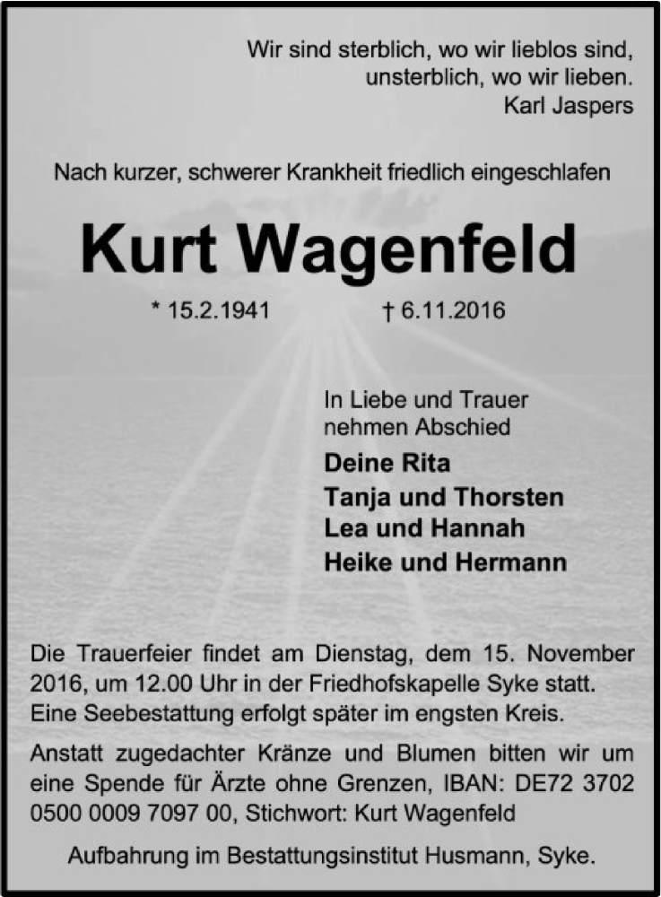 Hier finden Sie alle Traueranzeigen aus der Zeitung, die bisher für Kurt Wagenfeld erschienen sind. Weitere Traueranzeigen, die in der Zeitung erscheinen, werden hier ebenfalls aufgelistet