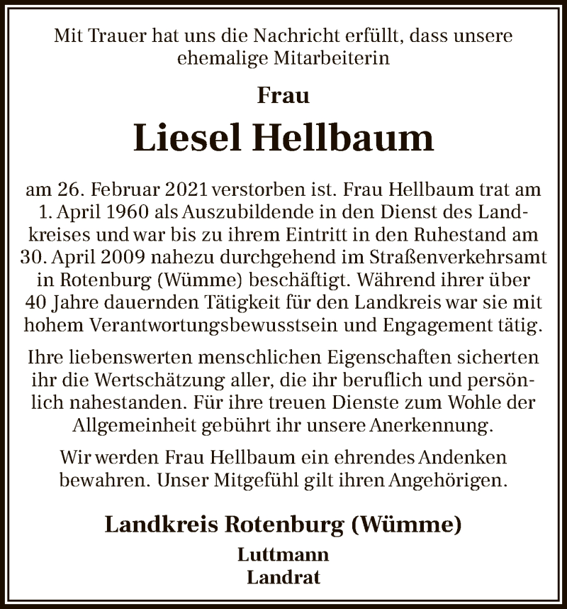 Hier finden Sie alle Traueranzeigen aus der Zeitung, die bisher für Liesel Hellbaum erschienen sind. Weitere Traueranzeigen, die in der Zeitung erscheinen, werden hier ebenfalls aufgelistet