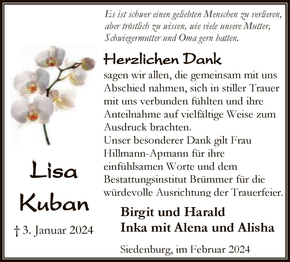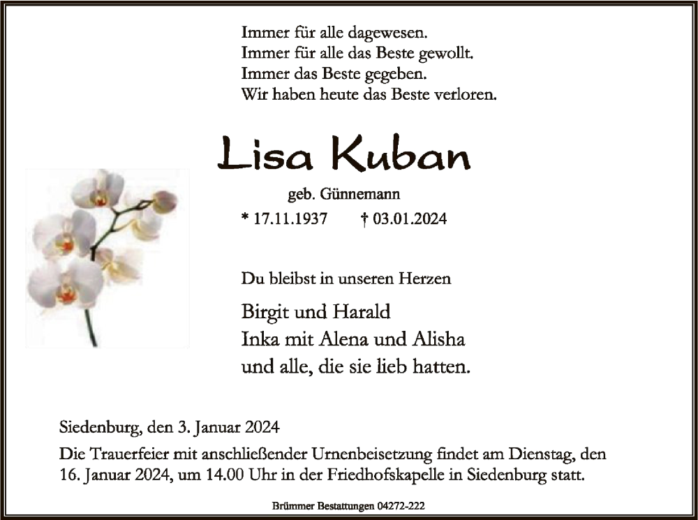Hier finden Sie alle Traueranzeigen aus der Zeitung, die bisher für Lisa Kuban erschienen sind. Weitere Traueranzeigen, die in der Zeitung erscheinen, werden hier ebenfalls aufgelistet
