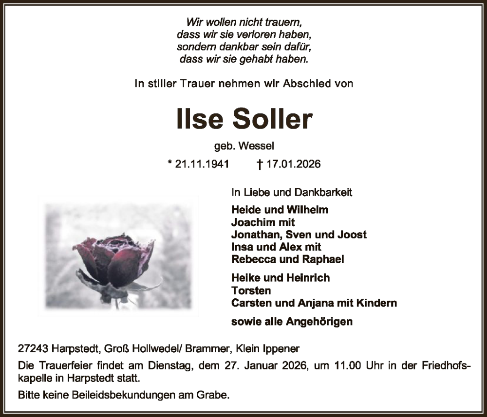 Hier finden Sie alle Traueranzeigen aus der Zeitung, die bisher für Lise Soller erschienen sind. Weitere Traueranzeigen, die in der Zeitung erscheinen, werden hier ebenfalls aufgelistet