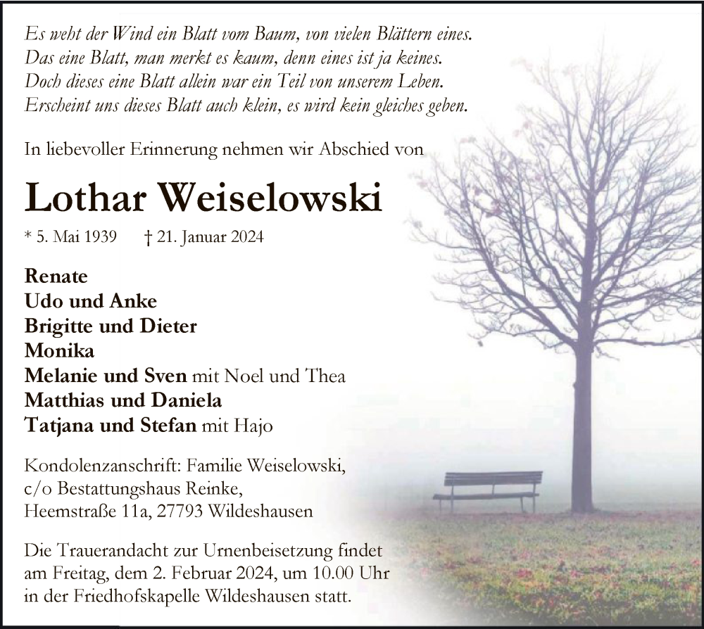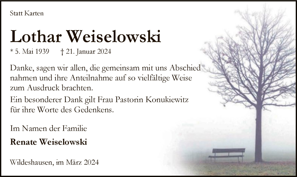 Hier finden Sie alle Traueranzeigen aus der Zeitung, die bisher für Lothar Weiselowski erschienen sind. Weitere Traueranzeigen, die in der Zeitung erscheinen, werden hier ebenfalls aufgelistet
