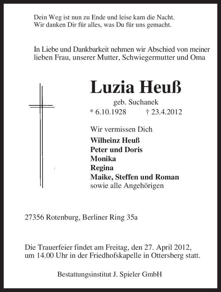 Hier finden Sie alle Traueranzeigen aus der Zeitung, die bisher für Luzia Heuß erschienen sind. Weitere Traueranzeigen, die in der Zeitung erscheinen, werden hier ebenfalls aufgelistet