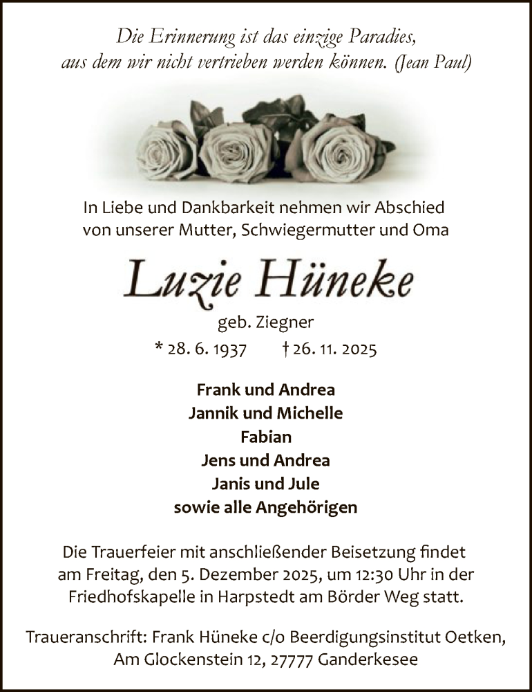 Hier finden Sie alle Traueranzeigen aus der Zeitung, die bisher für Luzie Hüneke erschienen sind. Weitere Traueranzeigen, die in der Zeitung erscheinen, werden hier ebenfalls aufgelistet