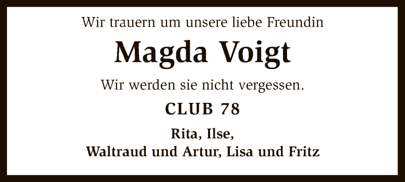 Hier finden Sie alle Traueranzeigen aus der Zeitung, die bisher für Magda Voigt erschienen sind. Weitere Traueranzeigen, die in der Zeitung erscheinen, werden hier ebenfalls aufgelistet