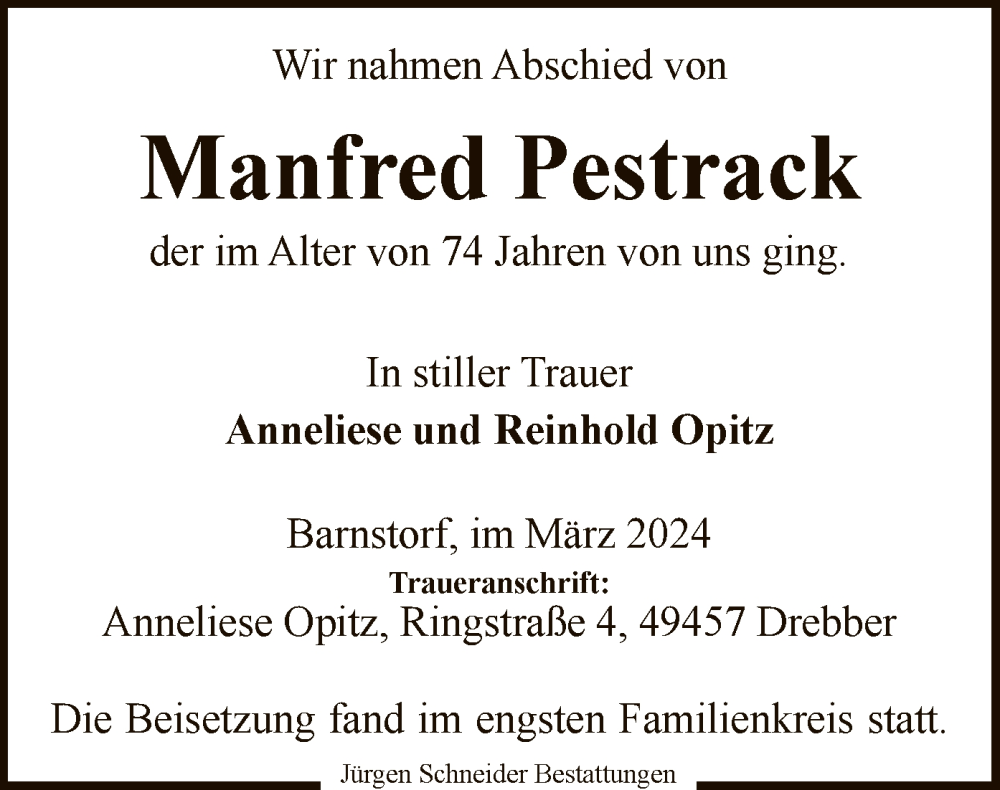Hier finden Sie alle Traueranzeigen aus der Zeitung, die bisher für Manfred Pestrack erschienen sind. Weitere Traueranzeigen, die in der Zeitung erscheinen, werden hier ebenfalls aufgelistet