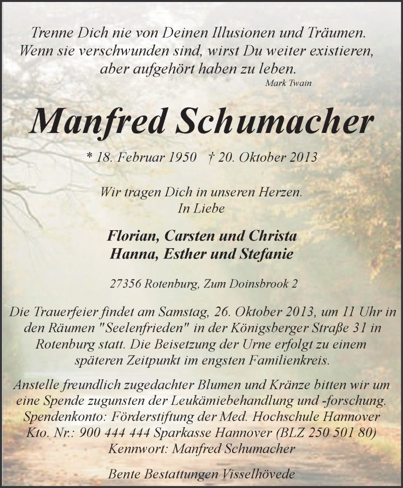 Hier finden Sie alle Traueranzeigen aus der Zeitung, die bisher für Manfred Schumacher erschienen sind. Weitere Traueranzeigen, die in der Zeitung erscheinen, werden hier ebenfalls aufgelistet