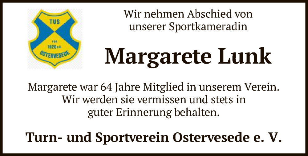Hier finden Sie alle Traueranzeigen aus der Zeitung, die bisher für Margarete Lunk erschienen sind. Weitere Traueranzeigen, die in der Zeitung erscheinen, werden hier ebenfalls aufgelistet