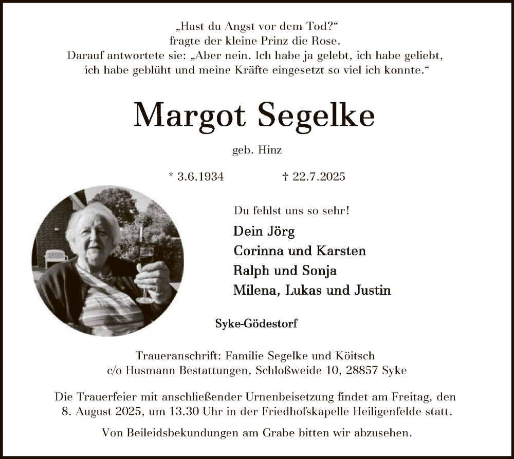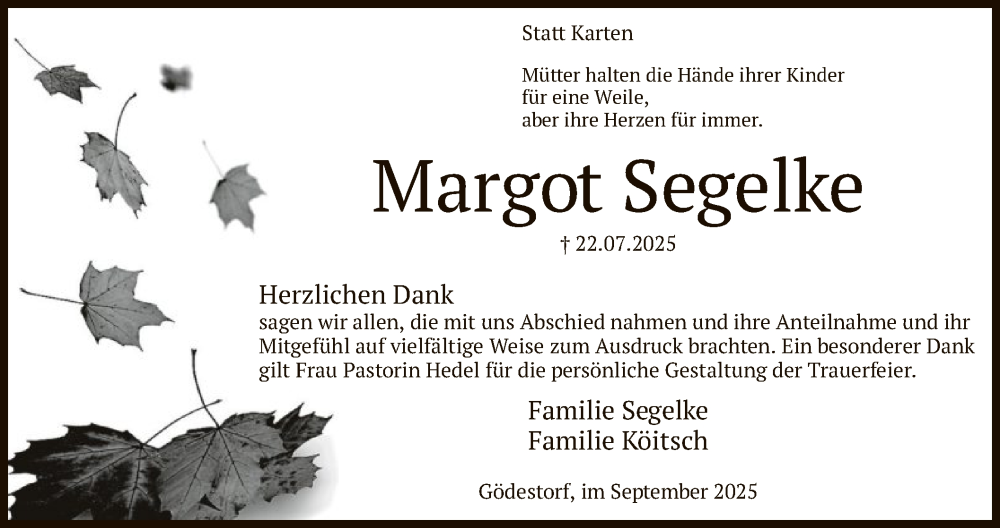 Hier finden Sie alle Traueranzeigen aus der Zeitung, die bisher für Margot Segelke erschienen sind. Weitere Traueranzeigen, die in der Zeitung erscheinen, werden hier ebenfalls aufgelistet