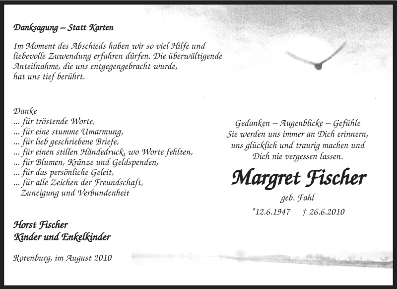 Hier finden Sie alle Traueranzeigen aus der Zeitung, die bisher für Margret Fischer erschienen sind. Weitere Traueranzeigen, die in der Zeitung erscheinen, werden hier ebenfalls aufgelistet