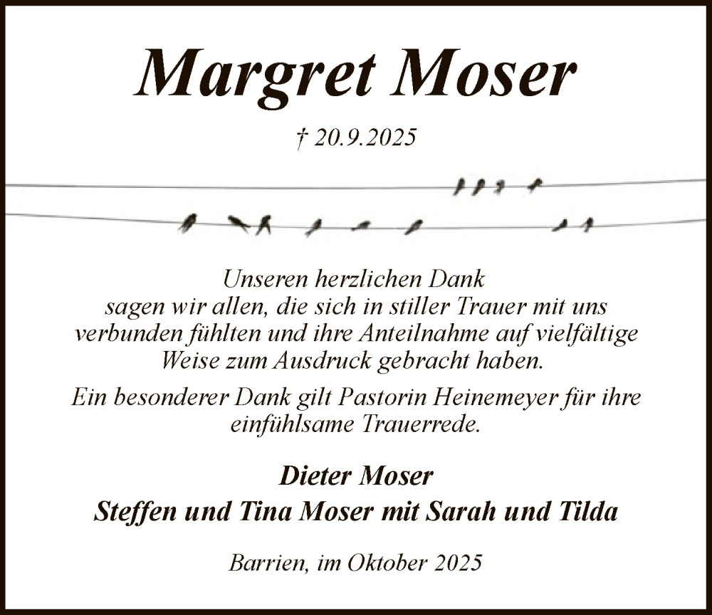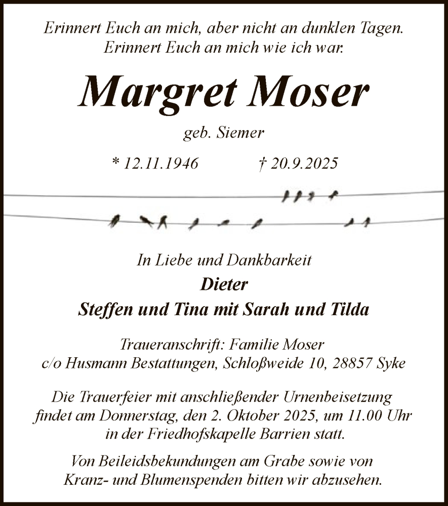 Hier finden Sie alle Traueranzeigen aus der Zeitung, die bisher für Margret Moser erschienen sind. Weitere Traueranzeigen, die in der Zeitung erscheinen, werden hier ebenfalls aufgelistet