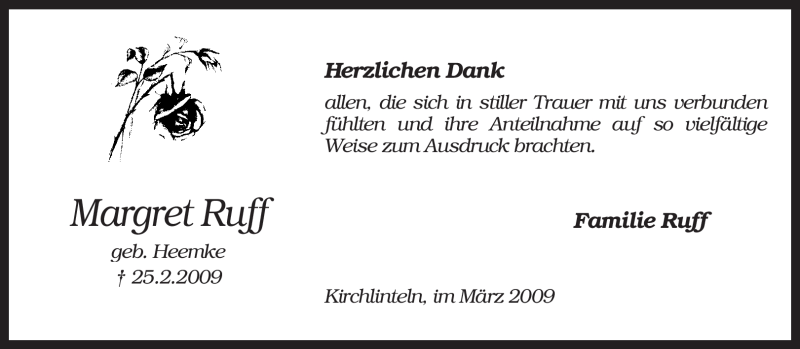 Hier finden Sie alle Traueranzeigen aus der Zeitung, die bisher für Margret Ruff erschienen sind. Weitere Traueranzeigen, die in der Zeitung erscheinen, werden hier ebenfalls aufgelistet