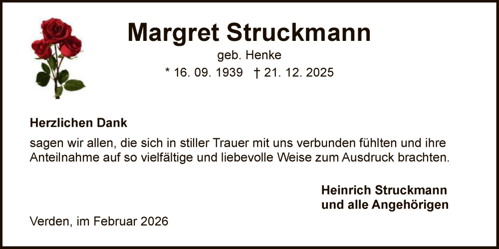 Hier finden Sie alle Traueranzeigen aus der Zeitung, die bisher für Margret Struckmann erschienen sind. Weitere Traueranzeigen, die in der Zeitung erscheinen, werden hier ebenfalls aufgelistet