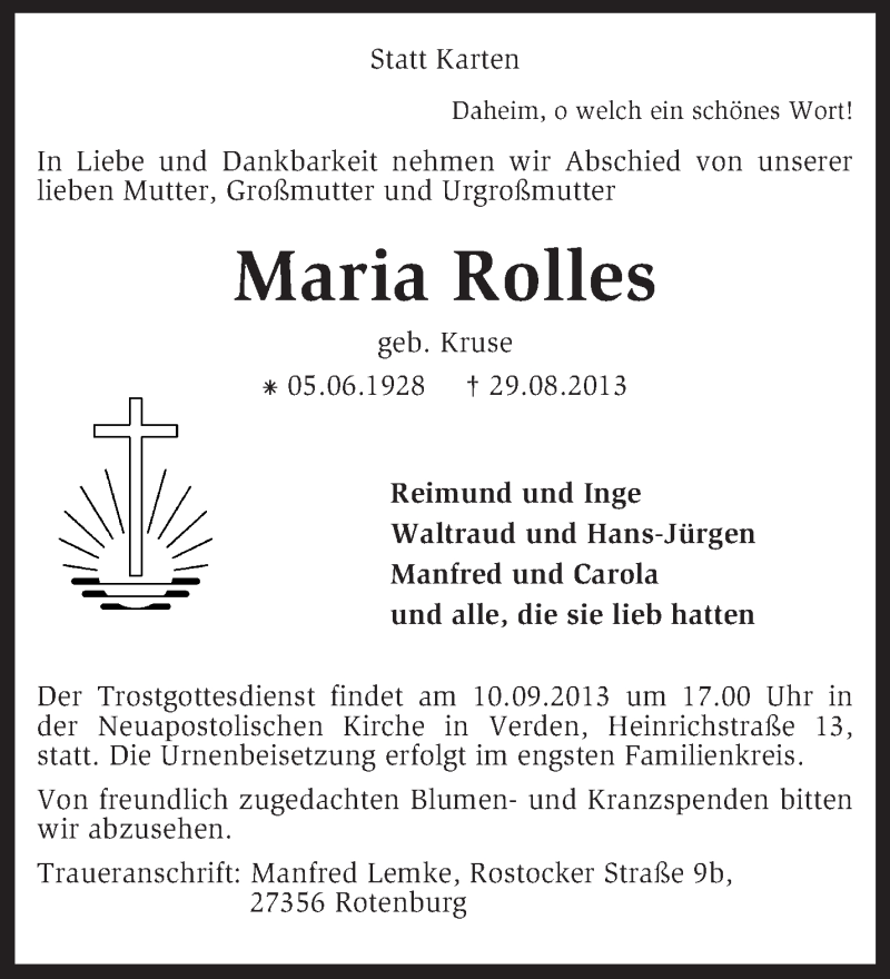Hier finden Sie alle Traueranzeigen aus der Zeitung, die bisher für Maria Rolles erschienen sind. Weitere Traueranzeigen, die in der Zeitung erscheinen, werden hier ebenfalls aufgelistet