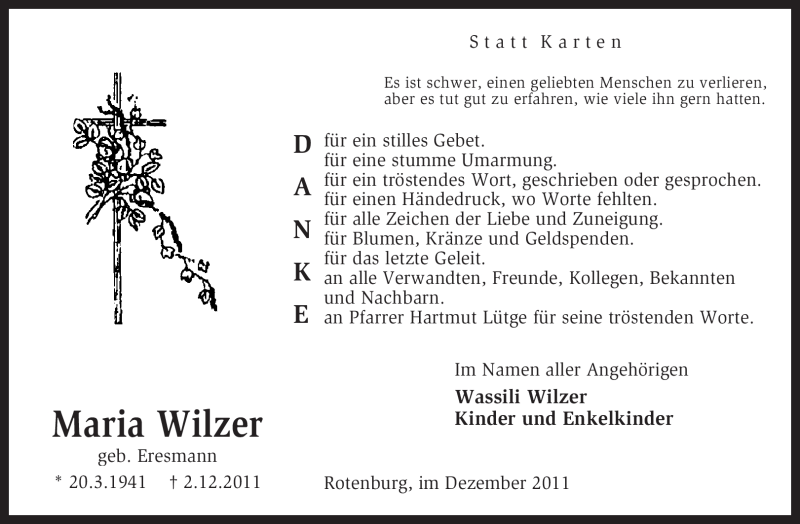Hier finden Sie alle Traueranzeigen aus der Zeitung, die bisher für Maria Wilzer erschienen sind. Weitere Traueranzeigen, die in der Zeitung erscheinen, werden hier ebenfalls aufgelistet