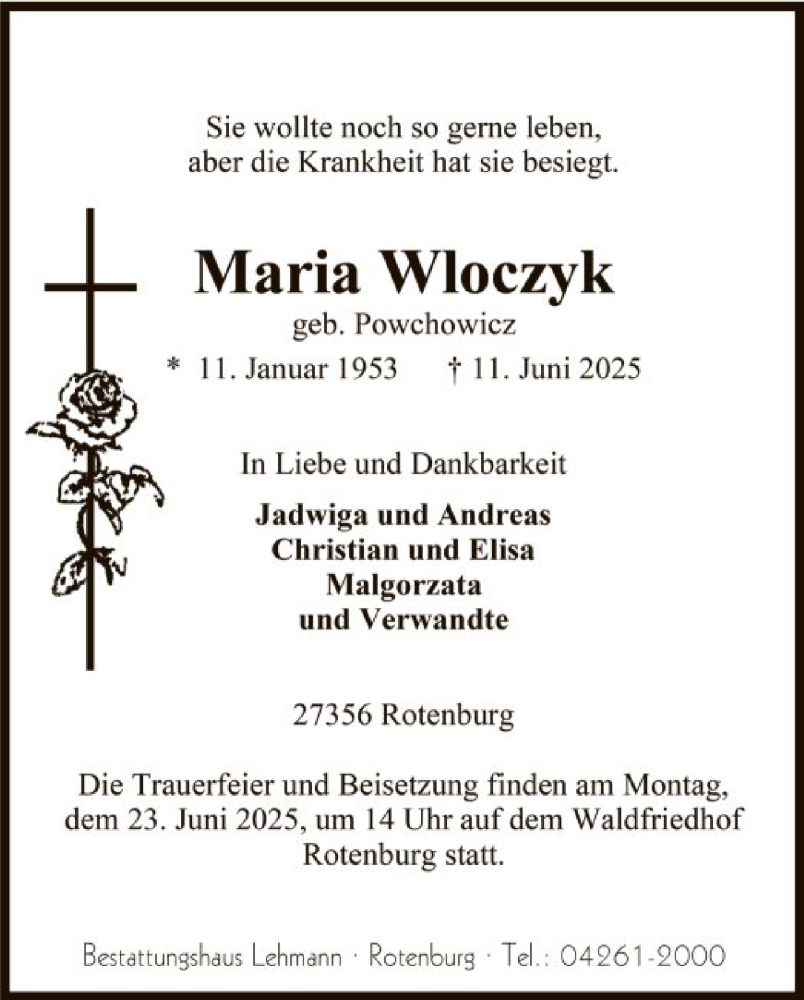 Hier finden Sie alle Traueranzeigen aus der Zeitung, die bisher für Maria Wloczyk erschienen sind. Weitere Traueranzeigen, die in der Zeitung erscheinen, werden hier ebenfalls aufgelistet