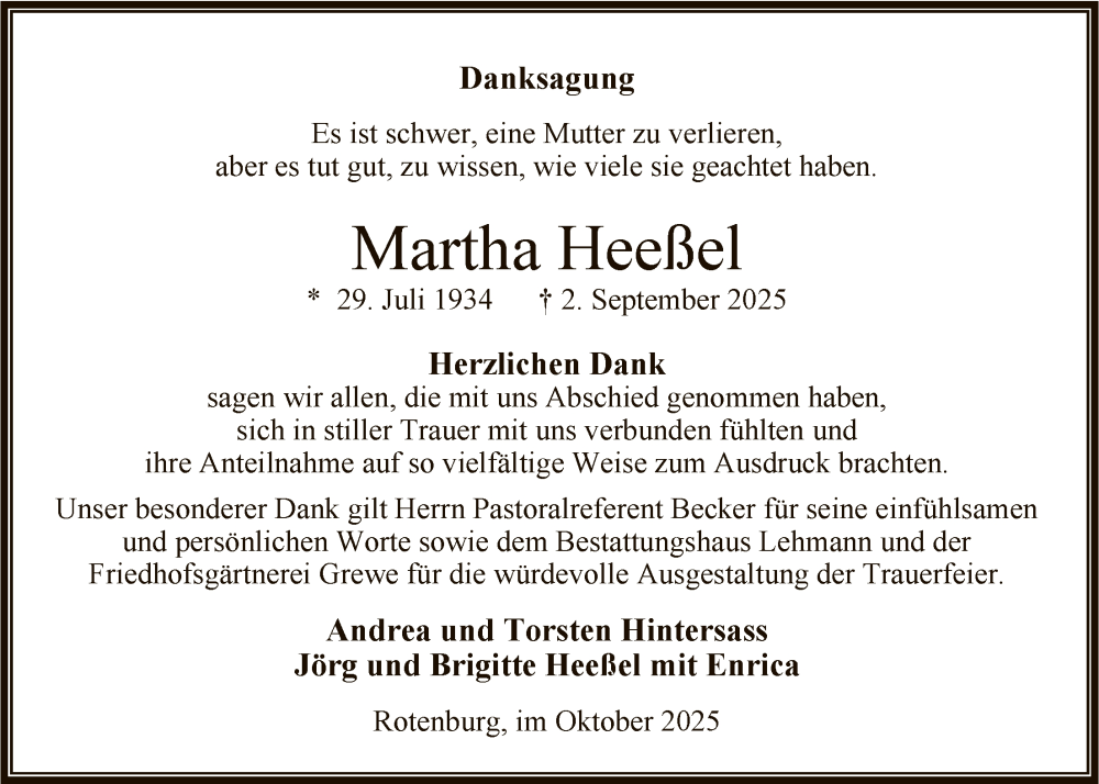 Hier finden Sie alle Traueranzeigen aus der Zeitung, die bisher für Martha Heeßel erschienen sind. Weitere Traueranzeigen, die in der Zeitung erscheinen, werden hier ebenfalls aufgelistet