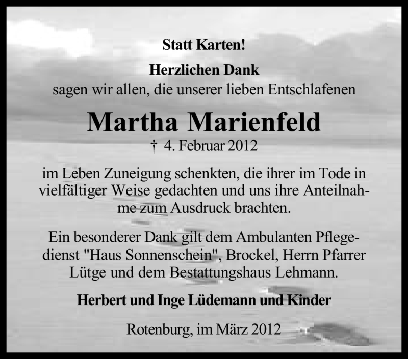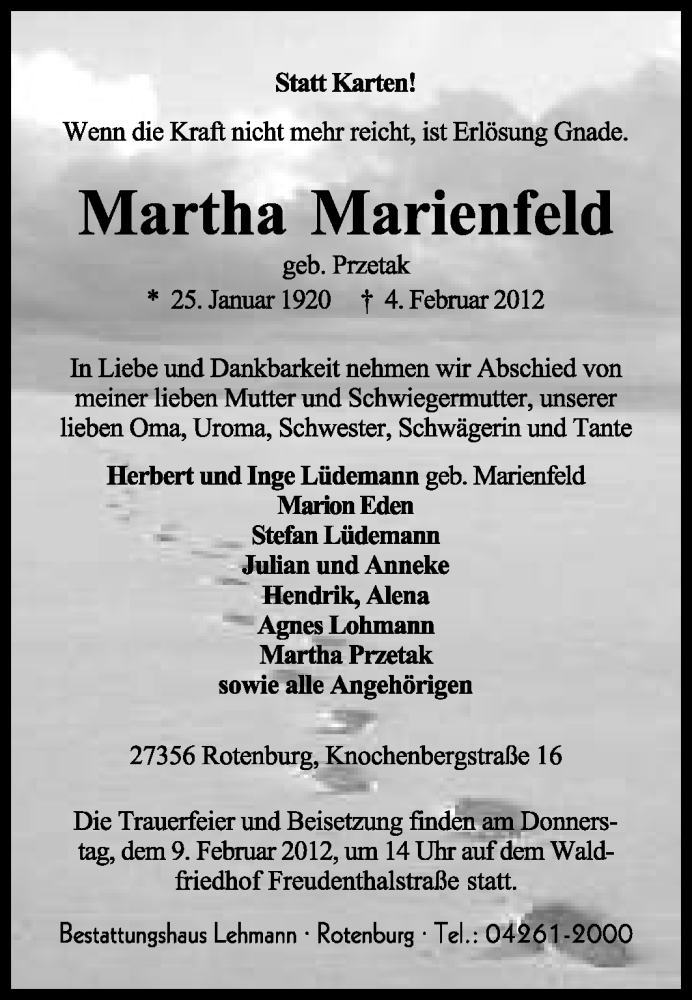 Hier finden Sie alle Traueranzeigen aus der Zeitung, die bisher für Martha Marienfeld erschienen sind. Weitere Traueranzeigen, die in der Zeitung erscheinen, werden hier ebenfalls aufgelistet
