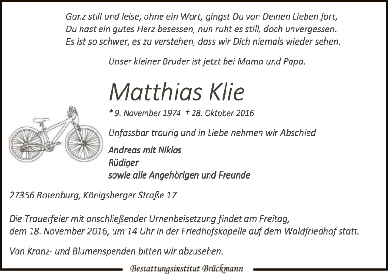 Hier finden Sie alle Traueranzeigen aus der Zeitung, die bisher für Matthias Klie erschienen sind. Weitere Traueranzeigen, die in der Zeitung erscheinen, werden hier ebenfalls aufgelistet