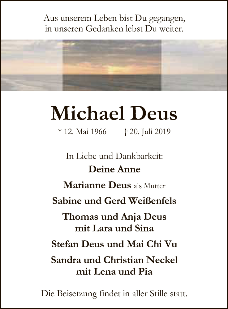 Hier finden Sie alle Traueranzeigen aus der Zeitung, die bisher für Michael Deus erschienen sind. Weitere Traueranzeigen, die in der Zeitung erscheinen, werden hier ebenfalls aufgelistet