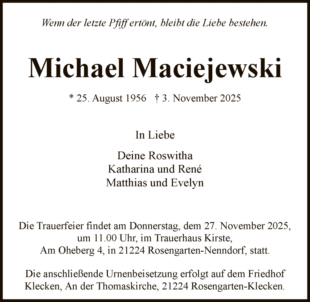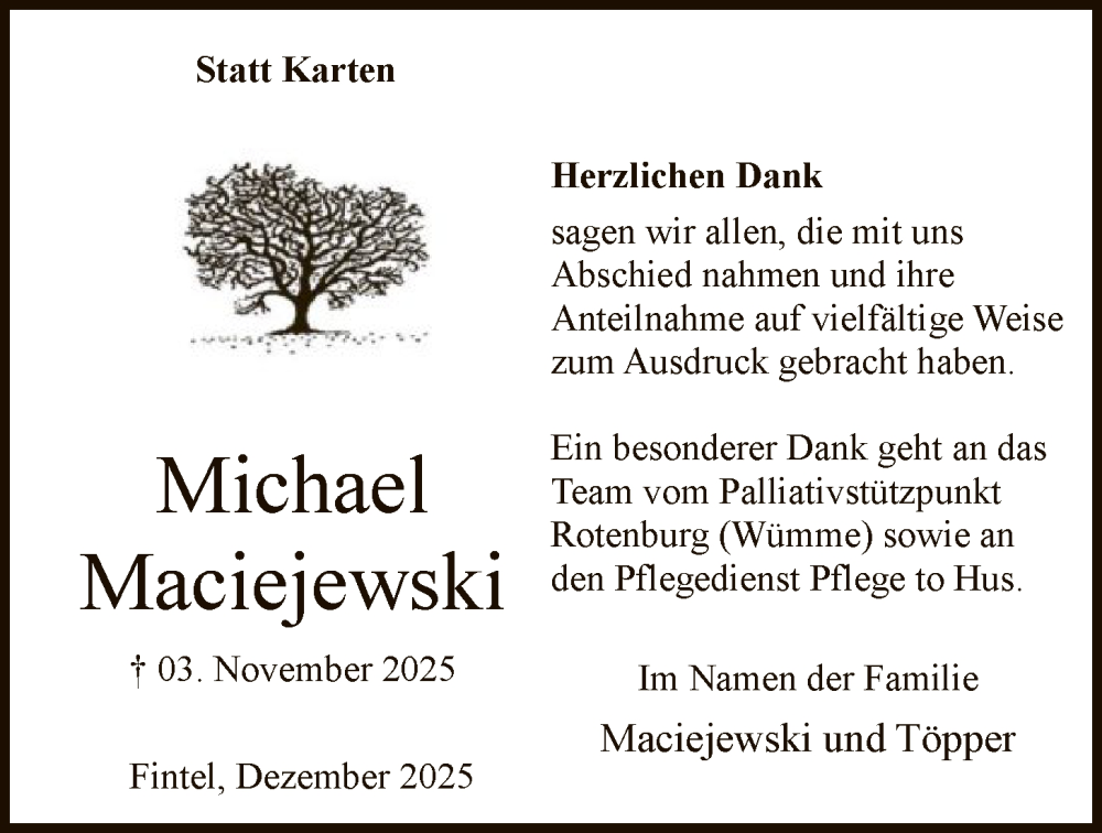 Hier finden Sie alle Traueranzeigen aus der Zeitung, die bisher für Michael Maciejewski erschienen sind. Weitere Traueranzeigen, die in der Zeitung erscheinen, werden hier ebenfalls aufgelistet