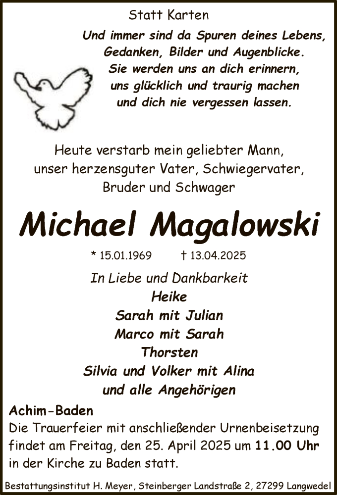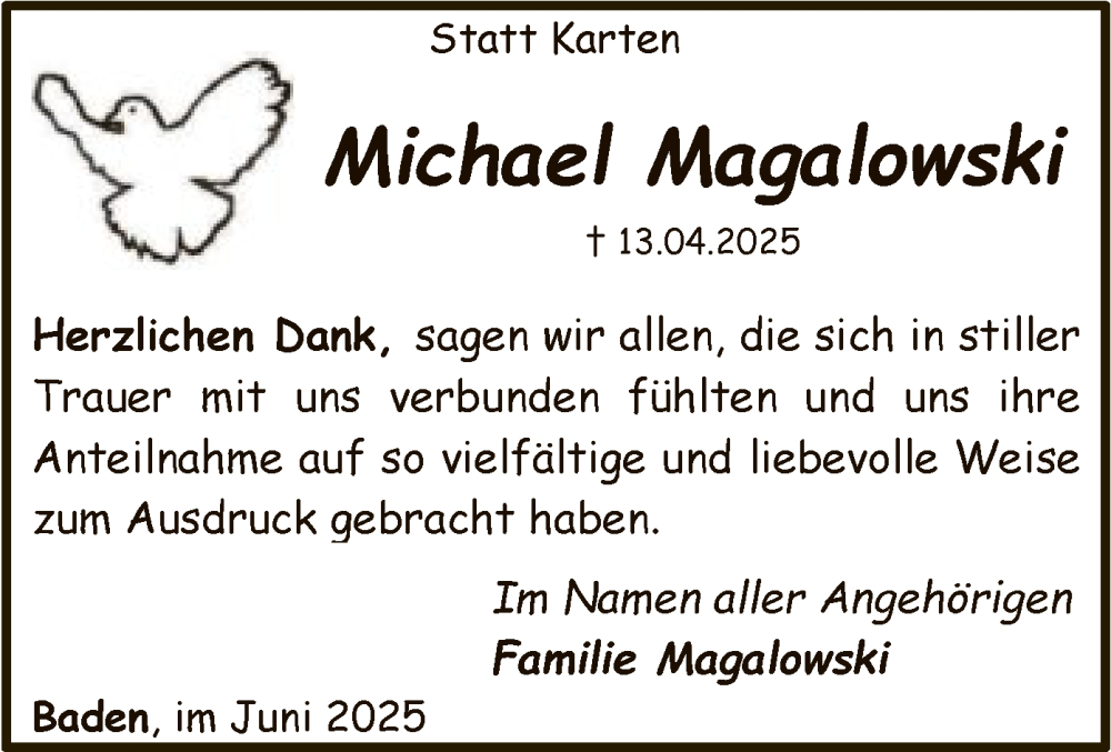 Hier finden Sie alle Traueranzeigen aus der Zeitung, die bisher für Michael Magalowski erschienen sind. Weitere Traueranzeigen, die in der Zeitung erscheinen, werden hier ebenfalls aufgelistet