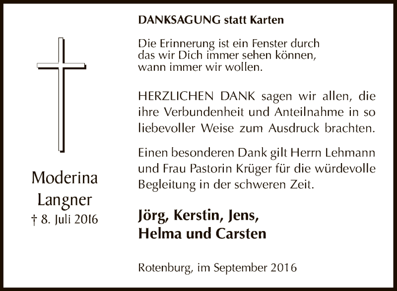 Hier finden Sie alle Traueranzeigen aus der Zeitung, die bisher für Moderina Langner erschienen sind. Weitere Traueranzeigen, die in der Zeitung erscheinen, werden hier ebenfalls aufgelistet