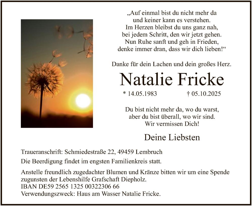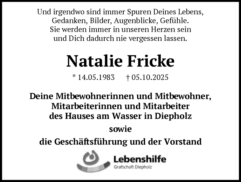 Hier finden Sie alle Traueranzeigen aus der Zeitung, die bisher für Natalie Fricke erschienen sind. Weitere Traueranzeigen, die in der Zeitung erscheinen, werden hier ebenfalls aufgelistet