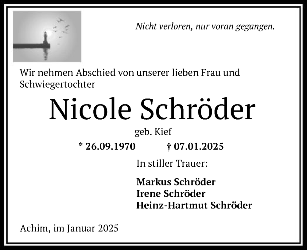 Hier finden Sie alle Traueranzeigen aus der Zeitung, die bisher für Nicole Schröder erschienen sind. Weitere Traueranzeigen, die in der Zeitung erscheinen, werden hier ebenfalls aufgelistet