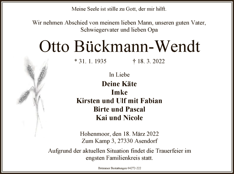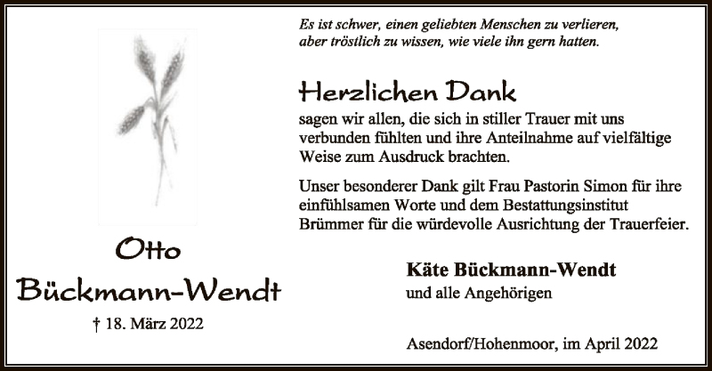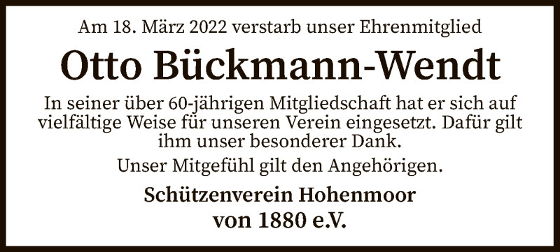 Hier finden Sie alle Traueranzeigen aus der Zeitung, die bisher für Otto Bückmann-Wendt erschienen sind. Weitere Traueranzeigen, die in der Zeitung erscheinen, werden hier ebenfalls aufgelistet