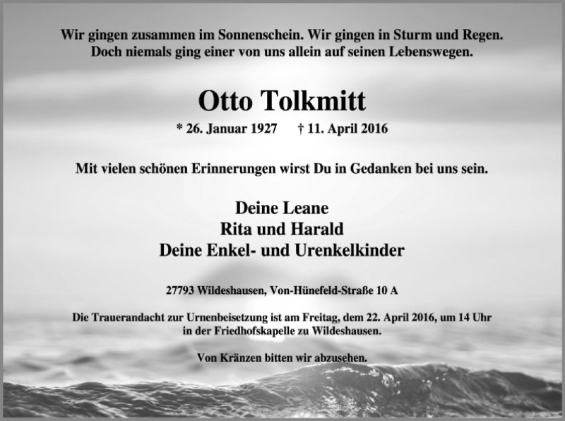 Hier finden Sie alle Traueranzeigen aus der Zeitung, die bisher für Otto Tolkmitt erschienen sind. Weitere Traueranzeigen, die in der Zeitung erscheinen, werden hier ebenfalls aufgelistet