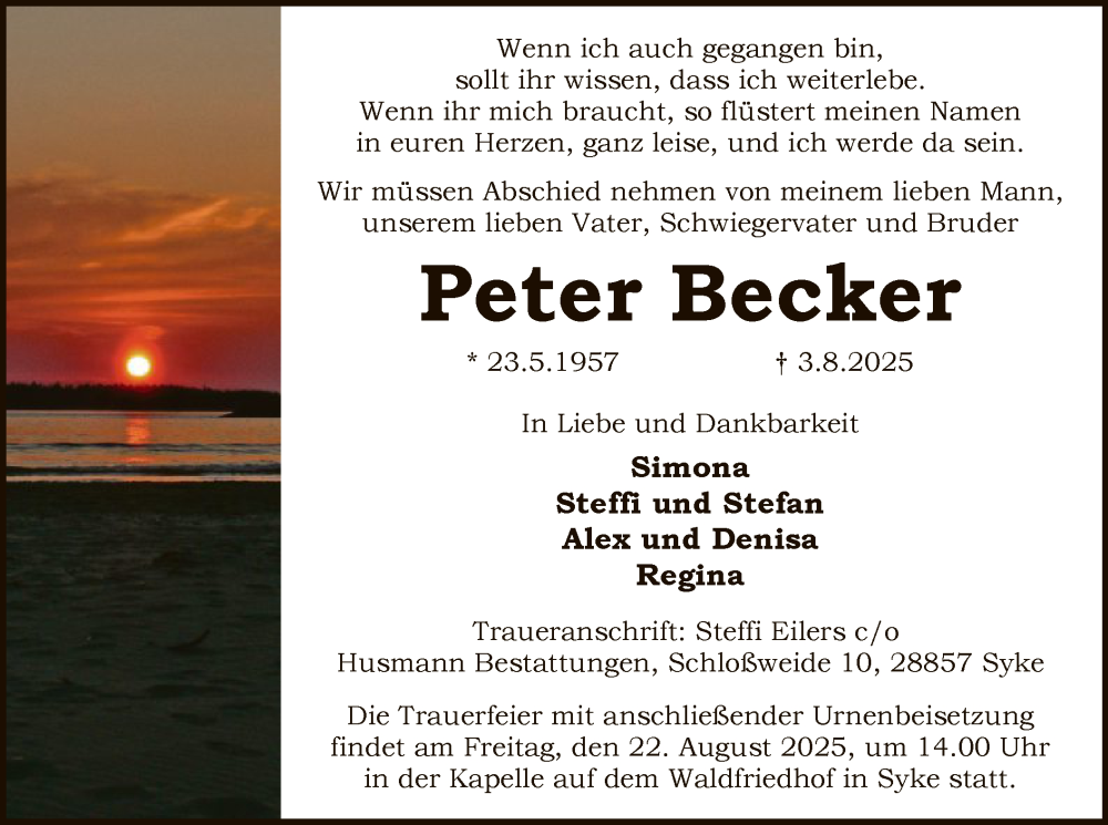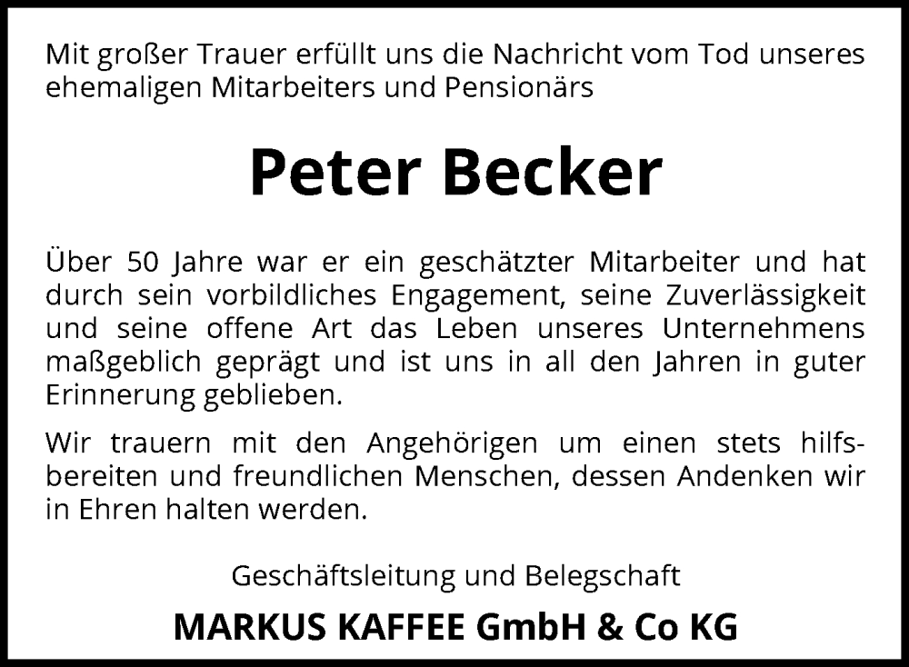 Hier finden Sie alle Traueranzeigen aus der Zeitung, die bisher für Peter Becker erschienen sind. Weitere Traueranzeigen, die in der Zeitung erscheinen, werden hier ebenfalls aufgelistet